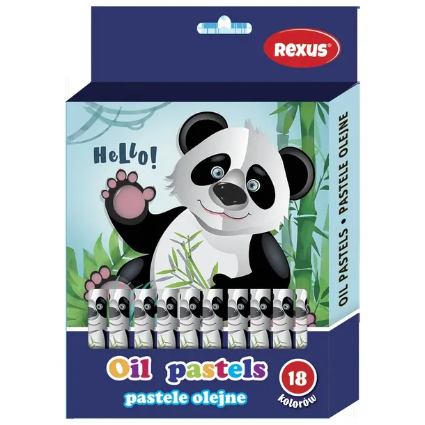 Pastele olejne 18 kolorów - między innymi - 3 odcienie zieleni, 3 odcienie niebieskiego, czerwony, żółty, pomarańczowy, szary, czarny, biały, brązowy, różowy, fioletowy. Pastele zapakowane w kartonowe pudełeczko oraz plastikową wytłoczkę oddzielającą kredki od siebie. Wielkość kredki około 7,5 cm. Każda kredka owinięta w papierową owijkę, aby uniknąć brudzenia palców podczas rysowania.Kolorowe pudełko z zawieszką w górnej części.