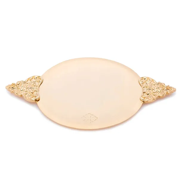 Pozłacana patena na kielich z uchwytami. Kolor złoty.