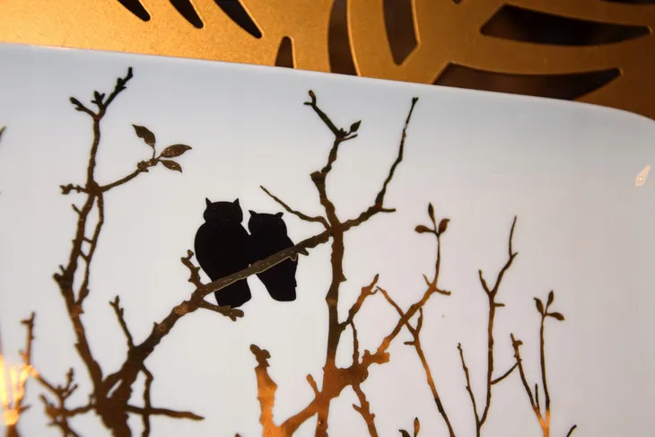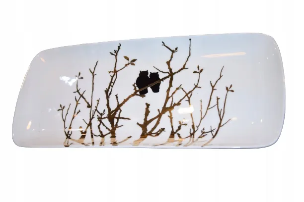 Patera ceramiczna biała prostokątna z motywem dwóch złotych sów - symbolu wiedzy i mądrości.