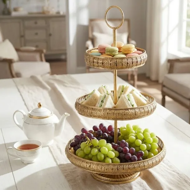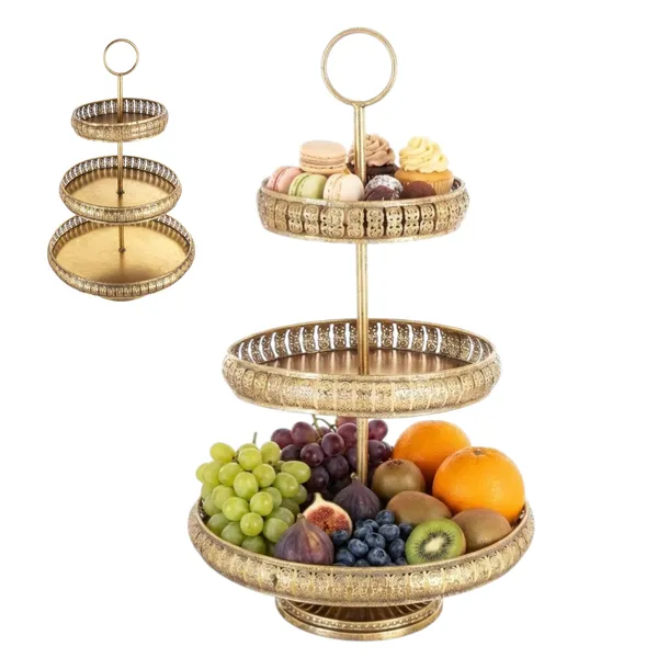 ✅ MISTERNE ZDOBIENIA I ARTYSTYCZNY DESIGN Patera wyróżnia się wyjątkowo bogatym zdobieniem brzegów każdego z trzech poziomów. Ażurowe, koronkowe wycięcia w metalu tworzą subtelny, biżuteryjny wzór, który w połączeniu z ciepłym odcieniem antycznego złota nadaje naczyniu unikatowego, historycznego charakteru.