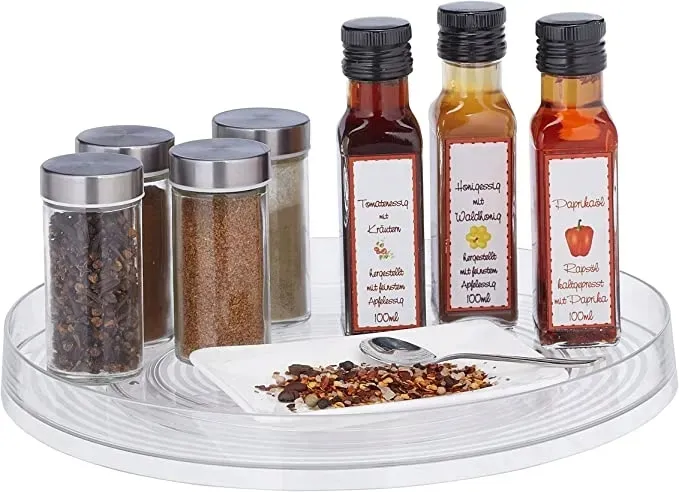Niezależnie od tego, czy jest to stojak na przyprawy na blacie kuchennym, czy do sosów w lodówce, dzięki obrotowemu organizerowi możesz przechowywać całą żywność w sposób oszczędzający miejsce, a jednocześnie zawsze w zasięgu ręki. Przezroczysta wielofunkcyjna taca obrotowa wykonana z wytrzymałego tworzywa sztucznego nadaje się nie tylko do organizacji kuchni, ale także zapewnia większą przejrzystość w szafce do przechowywania lub w łazience.