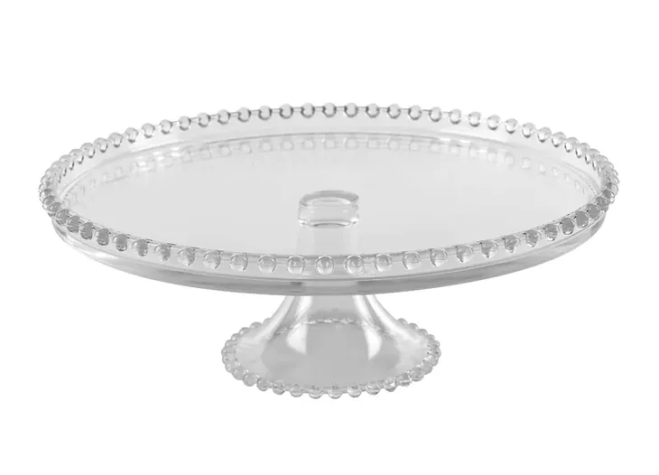 Szklana patera na wysokiej nóżce zdobiona uroczymi kuleczkami na obrzeżach zarówno talerza jak i na podstawie nóżki. Bardzo efektownie się prezentuje. Służy do użytku codziennego, ale także podczas niezwykłych uroczystości, nie zabraknie jej wdzięku i klasy. Patera, może stanowić doskonały pomysł na prezent.