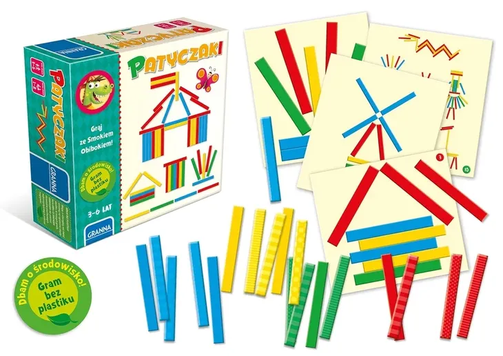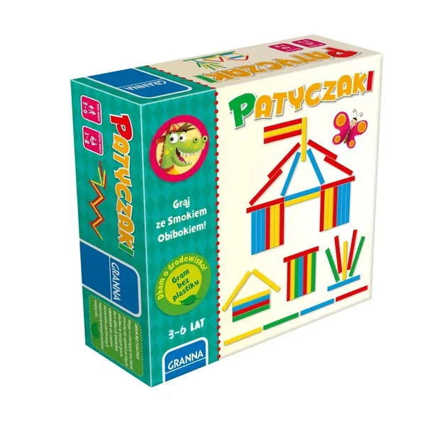 Patyczaki to gra przeznaczona dla najmłodszych dzieci. Zabawa polega na układaniu obrazków z patyczków. Dzieci mogą układać je z wzorów umieszczonych na planszach lub tworzyć własne kompozycje. Zabawa pomaga uruchamiać procesy analizy i syntezy. Patyczaki układane według wzorów umieszczonych w pudełku uczą rozpoznawania kształtów, kolorów i proporcji, pomogą w nauce liczenia i podstaw geometrii.