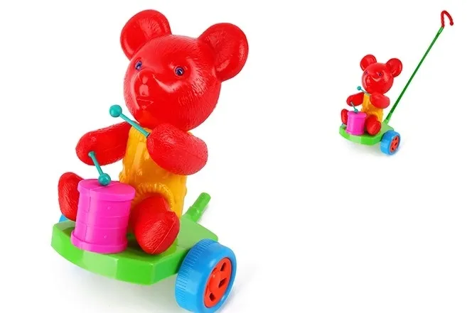 MIŚ Z BĘBENKIEM to zabawka do pchania wykonana z atestowanego i bezpiecznego dla dziecka tworzywa oraz w ciekawej i atrakcyjnej kolorystyce.