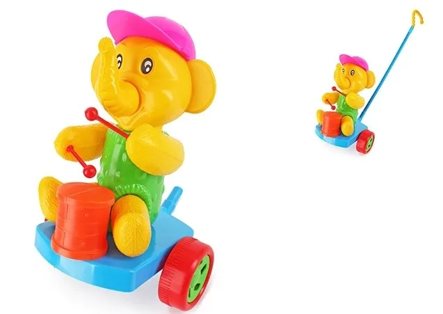 SŁOŃ Z BĘBENKIEM to zabawka do pchania wykonana z atestowanego i bezpiecznego dla dziecka tworzywa oraz w ciekawej i atrakcyjnej kolorystyce.