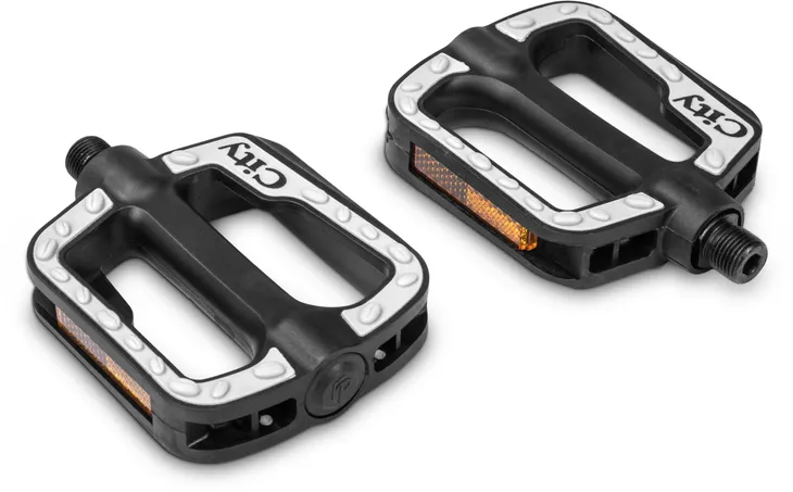 Pedały dedykowane do rowerów miejskich, wykonane tworzywa sztucznego wykończonego antypoślizgową matą. Zapewniają dobrą przyczepność buta. Wbudowane odblaski poprawiają widoczność na drodze.