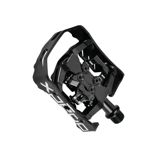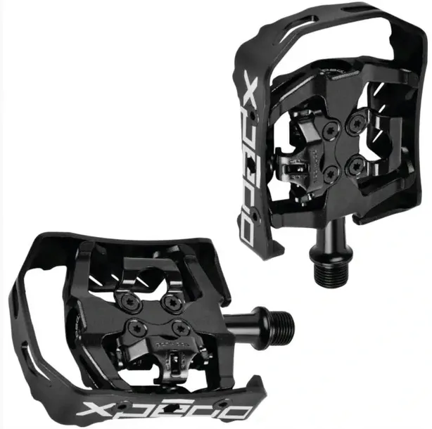 Dwustronne uniwersalne pedały platformowe MTB SPD dają możliwość wyboru zarówno jazdy w zwykłych butach do chodzenia, jak i specjalnych wpinanych butach SPD. Korpus i klatka wykonane z wysokiej jakości aluminium 6061 dostarczają wygodnego stabilnego podparcia buta. Stalowa oś Cr-Mo wraz jednym łożyskiem maszynowym, i jednym łożyskiem DU zapewniają długa gładką niezawodną pracę.