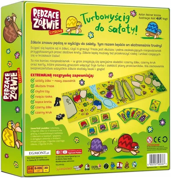 Turbowyścig do sałaty!Żółwie znowu pędzą w wyścigu do sałaty, ale tym razem będzie on ekstremalnie trudny.Ścigać się będzie aż 6 żółwi, czyli 6 graczy! Trasa jest dłuższa i pełna zaskakujących niespodzianek przygotowanych przez złośliwe krety. Żółwie będą musiały także przekroczyć rzekę i unikać czającego się w krzakach lisa! A to nie koniec niespodzianek – w grze znajdują się także specjalne dodatki: czarny żółw, czarny kruk oraz karty, które pozwolą graczom włączyć tryb turbo i zakłócić plany przeciwników. Jest to zatem wyścig pełen czyhających na graczy niebezpieczeństw i niesamowitych zwrotów akcji!W extremalnej wersji hitu „Pędzące żółwie” proponujemy znaną wszystkim grę z nowymi turbododatkami, które powodują, że szybkość jest naprawdę zawrotna. Wszystkie żółwie dostały kaski i gogle! Bezpieczeństwo naszych małych zawodników to podstawa!Wiek: +6Liczba graczy: 2-6Czas rozgrywki: około 30 min.Pędzące żółwie EXTREME - videoinstrukcja