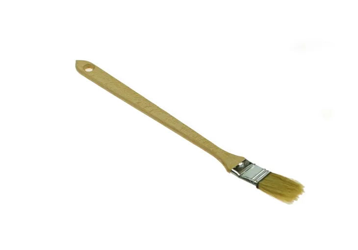 PĘDZEL NA DŁUGIM TRZONIE DREWNIANYM, ZAKRZYWIONY POD NIEWIELKIM KĄTEM W CZĘŚCI ROBOCZEJ W CELU UŁATWIENIA MALOWANIA W MIEJSCACH TRUDNO DOSTĘPNYCH. WYKONANY Z WŁOSIA NATURALNEGO.