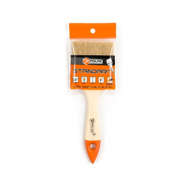Pędzel płaski POLAX "STANDART" to pędzel budżetowy. Pędzel wykonany jest z włosia mieszanego (50% włosia sztucznego i 50% włosia naturalnego), które dobrze chłonie farbę i równomiernie maluje powierzchnię. Przeznaczony jest do nakładania farb wodnych, olejnych, akrylowych, emalii i lakierów, a także farb zawierających rozpuszczalniki. Pędzel ma lekki plastikowy uchwyt z otworem do zawieszania. Opaska wykonana jest ze stali nierdzewnej. Włosie pędzla jest pakowane pojedynczo w wytrzymałą torebkę polietylenową, którą można łatwo zdjąć. Indywidualne opakowanie chroni włosie przed brudem, kurzem i uszkodzeniami mechanicznymi. Po użyciu pędzel jest łatwy w czyszczeniu i szybko schnie.