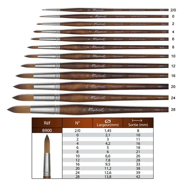 Seria 8900 – Raphael Precision nr 0. Okrągłe, artystyczne pędzle malarskie z elastycznego włosia syntetycznego, dającego dużą kontrolę nad farbą, przeznaczone do farb olejnych i akrylowych. Długi lakierowany trzonek.