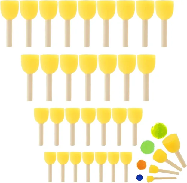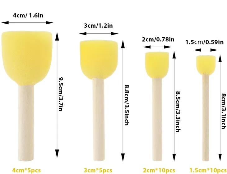 - Pędzel z gąbki malarskiej - łącznie 30 okrągłych pędzli piankowych z drewnianym uchwytem do malowania, dostępnych w 4 różnych rozmiarach. 5 okrągłych szczotek z gąbki 1,5", 5 okrągłych szczotek z gąbki 3,5 cm, 10 okrągłych szczotek z gąbki 0,75 cala, 10 okrągłych szczotek z gąbki 0,6". Wystarczająca ilość, aby spełnić Twoje wymagania dotyczące lakierowania. Zestaw pędzli piankowych