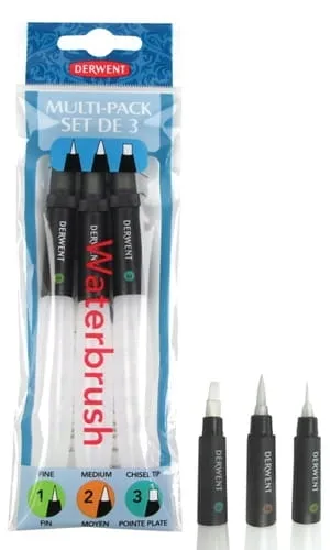 Pędzle Derwent z pojemnikiem na wodę zostały opracowane z myślą o artystach malujących w plenerze. Są szczelne, łatwe do czyszczenia i przenoszenia. Posiadają zawór zapobiegający kapaniu, dzięki któremu łatwo jest kontrolować przepływ wody. Pędzelki Fine, Medium i Chisel (okrągły cienki, okrągły średni i płaski) można łatwo rozpoznać po nadrukowanej na korpusie cyfrze. Płaski pędzelek zapewnia zarówno wyraźne, cienkie linie, jak i szerokie pociągnięcia, w zależności od ustawienia pędzla podczas pracy. Pędzelki z pojemnikami nadają się do wielokrotnego napełniania i są dostępne pojedynczo lub w atrakcyjnych cenowo zestawach zawierających 3 szt.
