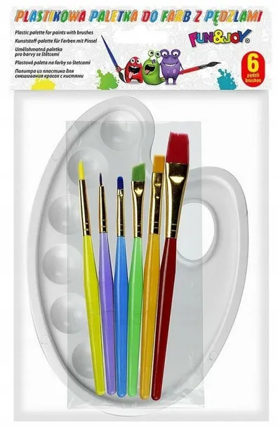 Praktyczna paletka malarska wykonana z gładkiego, białego tworzywa sztucznego. Dodatkowo w zestawie 6 pędzli różnej grubości z kolorowymi, akrylowymi uchwytami. Paletka z 7 wgłębieniami do mieszania kolorów. Idealna do przygotowywania i mieszania farb przed ich nakładaniem. Wygodny otwór na palec ułatwia trzymanie i zapewnia swobodne malowanie. Polecane szczególnie do farb akrylowych, temper, akwareli. Kolor paletki: biały. Wymiary paletki: 13 x 18,5 cm.