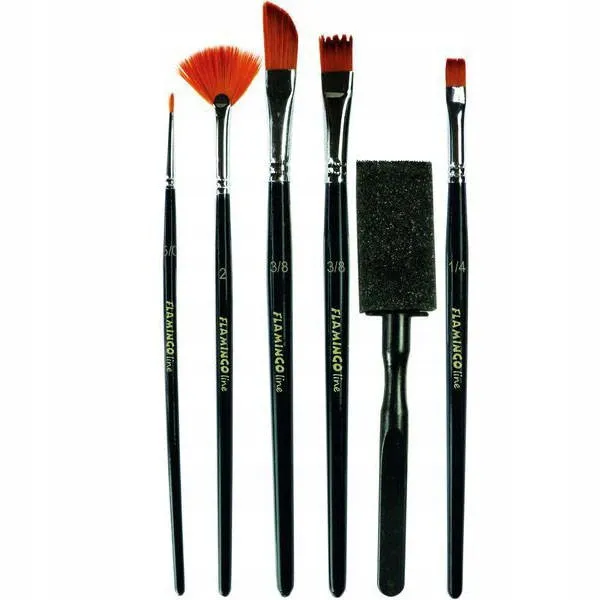 |okrągły nr 5/0|; |płaski nr 1/4|; |płaski grzebieniowy nr 3/8|; |płaski ścięty owalnie nr 3/8|; |wachlarzowy nr 2|; |gąbkowy płaski 2,5x5cm, grubość gąbki 1,2cm|