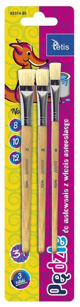 Pędzle do malowania z naturalnego, sztywnego włosia. Płaski kształt. Rączka z drewna brzozowego. Opakowanie: display 3 sztuki (dostępne w rozmiarach: 4, 6, 8 (KE014-AS) / 8, 10, 12 (KE014-BS)).