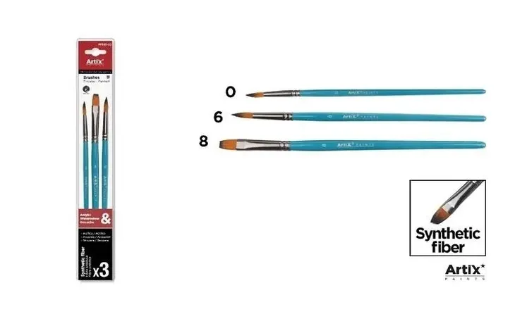 Profesjonalny pędzel wykonany z bardzo miękkiego włosiasyntetycznego. Idealny do tempery, farb akrylowychi akwareli. Metalowa skuwka i korpus z drewnalakierowanego na turkus. Długość: 19,5 cm. Blisterpo 3 sztuki: 2 z okucią okrągłą nr 0 i 6 oraz1 z okucią płaską nr 8.