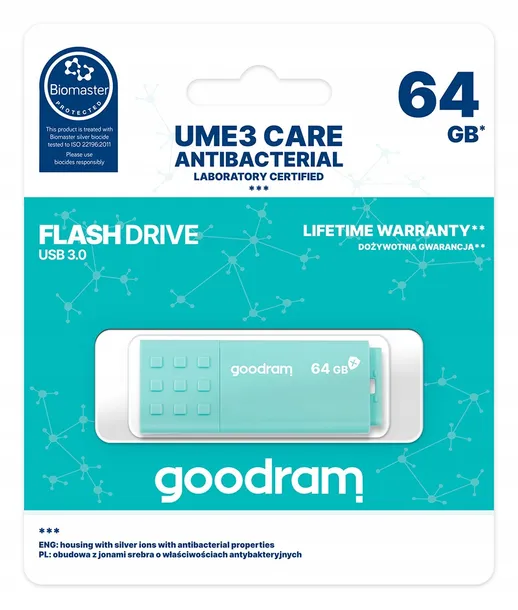 Pierwsza pamięć USB marki GOODRAM o właściwościach antybakteryjnych. Nadanie takich cech produktu było możliwe dzięki zastosowaniu technologii Biomaster. Polega ona na dodaniu jonów srebra do materiału tworzącego obudowę pamięci USB. Srebro hamuje rozwój, a w rezultacie zabija bakterie znajdujące się na powierzchni urządzenia. Po dwóch godzinach redukcja drobnoustrojów wynosi aż 60%. W efekcie końcowym po upływie 24 godzin technologia Biomaster likwiduje do 99% szkodliwych mikroorganizmów.