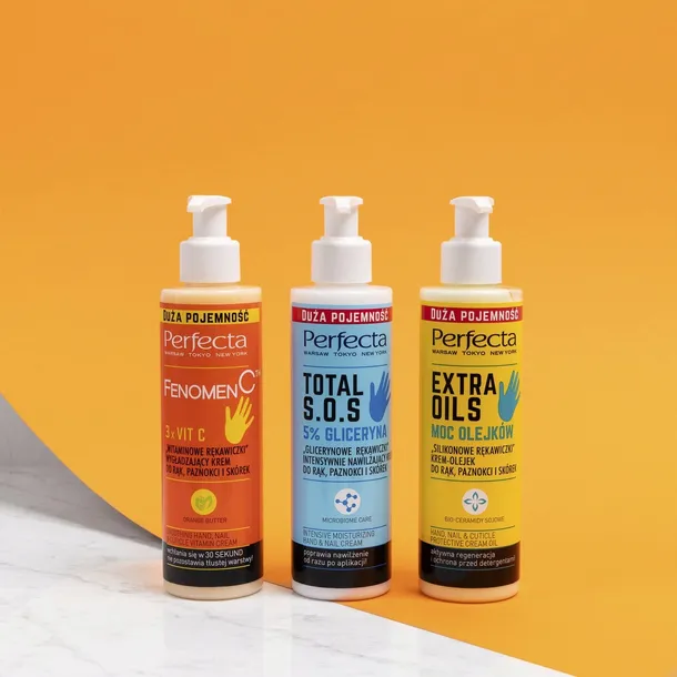 Perfecta Fenomen C Witaminowe Rękawiczki do Rąk i Paznokci to intensywnie wygładzający krem do codziennej pielęgnacji dłoni, stworzony z myślą o skórze suchej, szorstkiej i wymagającej regeneracji. Nowoczesna formuła inspirowana efektem „rękawiczek ochronnych” zapewnia dłoniom natychmiastowy komfort, głębokie nawilżenie oraz wyraźną poprawę wyglądu już od pierwszego użycia. Krem szybko się wchłania, nie pozostawia tłustej warstwy i doskonale sprawdza się zarówno w pielęgnacji dziennej, jak i nocnej. Dzięki połączeniu potrójnej witaminy C, masła pomarańczowego oraz kompleksu witamin E i F, produkt skutecznie wygładza skórę dłoni, wzmacnia paznokcie i dba o skórki, przywracając im estetyczny, zadbany wygląd.