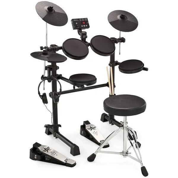 - Zawiera okablowanie, siedzisko, słuchawki, pałki, uchwyt na pałki i zasilacz (100-240 V)Układ bębnów