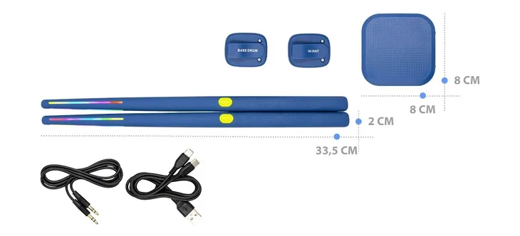 - Wyposażenie: Kabel AUX, Kabel USB-A – C, Moduł główny, Pałki perkusyjne, Pedał basowy, Pedał hi-hat