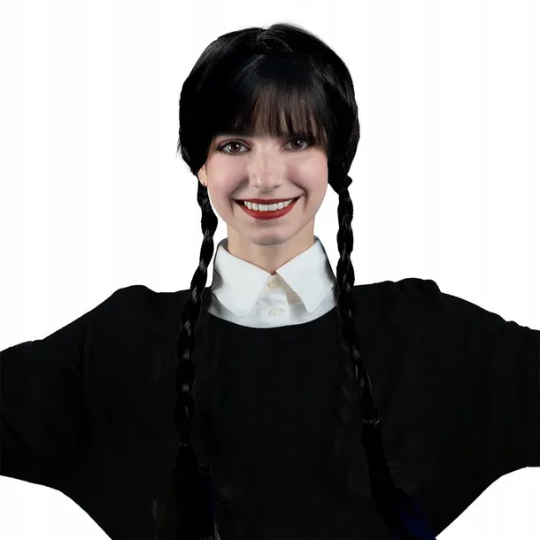 Peruka z warkoczami z włosów syntetycznych w kolorze czarnym. Gadżet do charakteryzacji na bal przebierańców, zabawę tematyczną, sesje zdjęciowe. Idealna jako uzupełnienie przebrania na halloween.