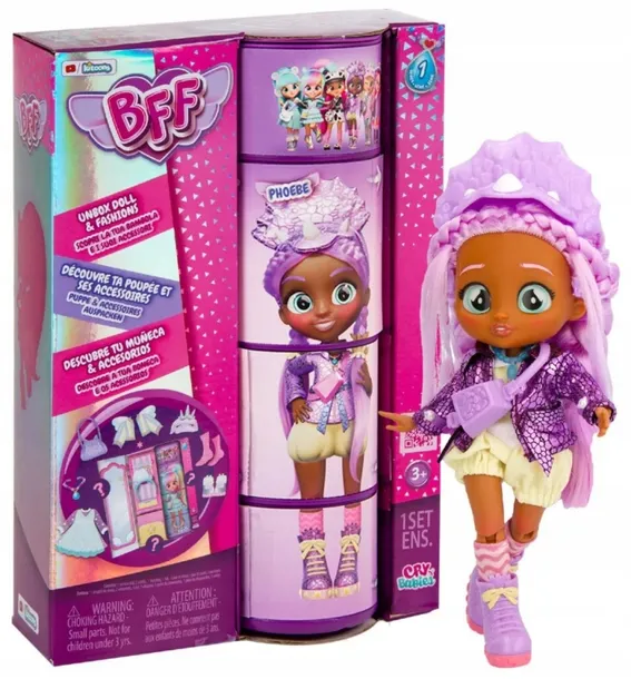 Poznaj nowe BFF - Najlepsze Przyjaciółki!Teraz Twoje ulubione bohaterki z Cry Babies Magic Tears dorosły i są już nastolatkami! Mają 13 lat i czeka na nie wiele przygód. W kolekcji jest 6 lalek do zebrania, a każda z nich ubrana jest w trendy strój zgodny z ostatnim krzykiem mody. Mają 15 cm wysokości, kolorowe włosy, kryształowe oczka i w pełni ruchome ciała. Którą Najlepszą Przyjaciółkę wybierzesz? Obróć tubkę, aby się przekonać! Odpakuj i odkryj ich garderobę razem z ponad 9 niespodziankami: 2 częściami stroju, torbą, opaską lub nakryciem głowy, parą dopasowanych bucików ze skarpetkami oraz naszyjnikiem! Lalki BFF mają jedwabiste, nylonowe włosy oraz prawdziwie modne stroje! Każda lalka zapakowana jest w jedyne w swoim rodzaju pudełko, które jest jednocześnie ich garderobą! Obróć kawałkami tuby, aby odkryć różne pozy, które może przybrać Twoja Najlepsza Przyjaciółka!Energiczne, urocze i zachwycające bohaterki serialu Cry Babies Magic Tears (Kristal, Stella, Katie, Jenna, Dotty, Phoebe) są teraz pewnymi siebie nastolatkami, z niezmiennym urokiem, swoją dotychczasową niewinnością oraz cudownymi żda z 6 kolekcjonerskich lalek posiada swój unikalny styl, który doskonale wpisuje się w aktualne trendy modowe. Piękne, kolorowe włosy, barwne ubrania i ciekawe akcesoria sprawiają, że zabawa jest jeszcze lepsza. Dzięki ruchomym częściom ciała, lalki można ustawiać w ciekawe pozy. Każda lalka zapakowana jest w jedyne w swoim rodzaju pudełko, które jest jednocześnie jej garderobą!Phoebie jest miłośniczką fioletu - ma fioletowe włosy, żółty kombinezon z fioletowo-metaliczną kurtką, wojskowe buty i wysokie skarpetki! Do tego fioletowa torebka, opaska inspirowana dinozaurami oraz wyjątkowy naszyjnik szczególne:postaci znane ze świata Cry Babies Magic Tears,produkty Cry Babies rosną razem z dziećmi BFF przeznaczone są dla dziewczynek w wieku 3+,wysokość lalki: 20 cm,opakowanie stanowi integralny element zabawy - jest garderobą,6 akcesoriów-niespodzianek,lalki mają ruchome ciała, dzięki czemu mogą pozować w szałowym, modowym stylu - niczym na wybiegu!