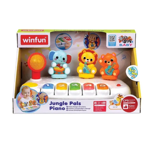 Winfun Jungle Pals Piano Pianinko z Przyjaciółmi z DżungliKolorowe, interaktywne pianinko z figurkami zwierzątek, które zachęca maluchy do odkrywania muzyki i rozwijania zmysłów. Idealne dla dzieci od 12 miesiąca życia.Cechy produktu:5 dużych, kolorowych przycisków-klawiszy, oznaczonych cyframi (15),3 urocze figurki zwierzątek z dżungli (słoń, lew, miś) grające na instrumentach,Funkcja odtwarzania melodii i dźwięków każde zwierzątko może grać własną linię melodyczną,Interaktywne światło w stylu reflektora, które pulsuje w rytm muzyki,Tryb Wypróbuj mnie dziecko może samodzielnie odkrywać dźwięki.Rozwija:Wrażliwość muzyczną i słuch,Umiejętności poznawcze i motoryczne,Koordynację ręka-oko,Zdolności społeczne poprzez interakcję z zabawką i zabawę w grupie.Wiek: 12 miesięcy+System wspomagania rozwoju: CPS (Creative Parenting System) Stage 3 (Social)Producent: WinfunSeria: Beat Bop Baby