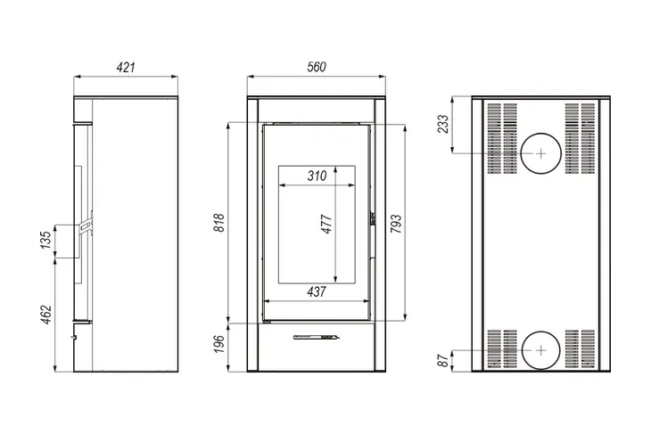 - Doprowadzenie powietrza z zewnątrz podłączyć można od dołu lub od tyłu co ułatwia dostosowanie montażu piecyka w zależności od planów i potrzeb.