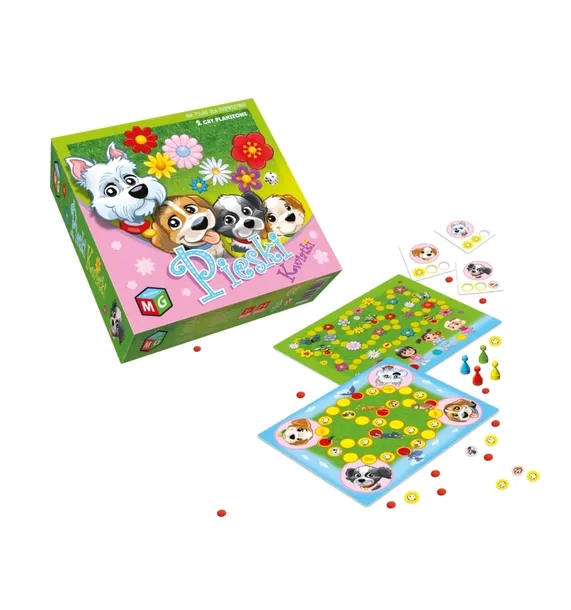 Zestaw zawiera 2 gry planszowe: Pieski - wyprowadź swojego pieska na spacer. Czy uda mu się spotkać swojego dobrego przyjaciela, czy będzie potrafił złapać swoją piłeczkę? kwiatki - to łatwa, zapewniająca dobrą, wesołą zabawę, gra dla najmłodszych. Która z dziewczynek zbierze najszybciej lub najwięcej kwiatków? Zestaw zawiera: • 2-stronną planszę, • 4 pionki • 20 żetonów plastikowych, • kostkę do gry, • 4 tabliczki z pieskami, •12 żetonów tekturowych, • instrukcję.