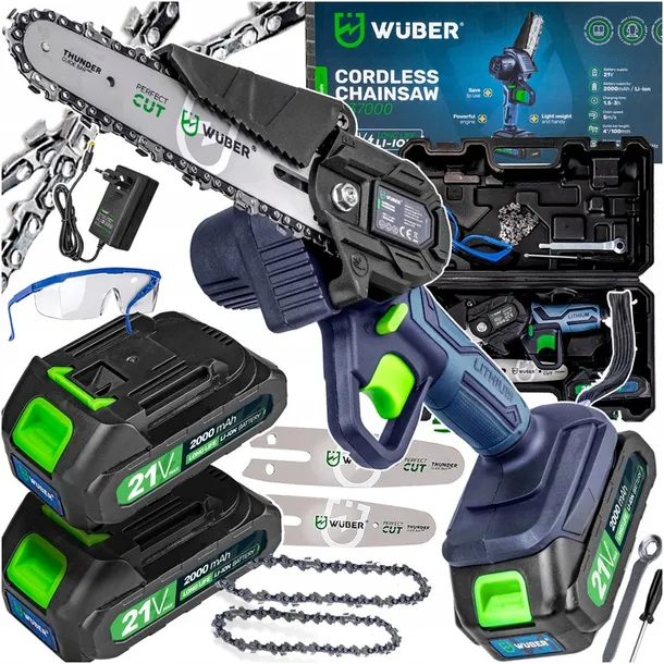 Ta wysokiej jakości mini piła gałęziowa akumulatorowa Wuber wyróżnia się kompaktową, ergonomiczną konstrukcją i niezawodnymi funkcjami, które ułatwiają precyzyjne cięcie. Z dwoma akumulatorami Li-ion 2000mAh o napięciu 21V, prędkością łańcucha 5m/s i mocą 400W, radzi sobie z drewnem o różnej twardości – od drobnych gałęzi po grubsze konary – zapewniając płynną pracę bez przerw i spadków wydajności.