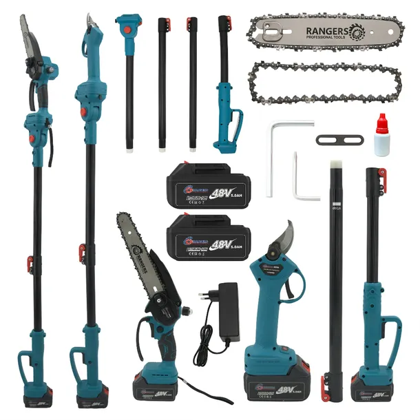 MEGA ZESTAW 2-w-1 Rangers RS-6011: akumulatorowy sekator i pilarka z 2 × 48 V 6 Ah, ładowarką i wysięgnikiem 2 m
