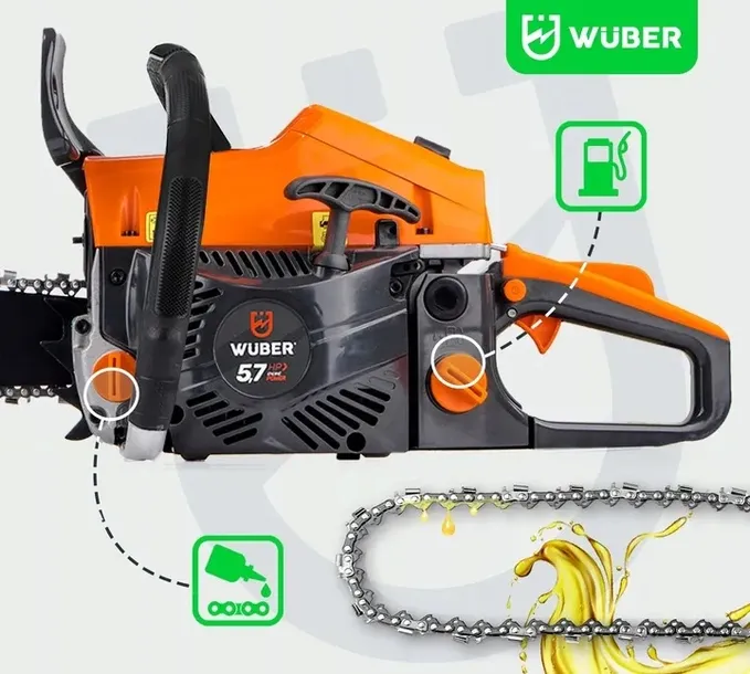 Ta łańcuchowa piła spalinowa Wuber GCS-570 o mocy 5,7 KM wyróżnia się solidną konstrukcją z chromowanym cylindrem i metalowym sprzęgłem na dwóch sprężynach, co zapewnia niezawodne przenoszenie mocy bez zakłóceń. Z pojemnością 58 cm³ i obrotami do 11000 obr/min, bez problemu radzi sobie z grubymi pniami i gałęziami, gwarantując płynne i efektywne cięcie w każdych warunkach.