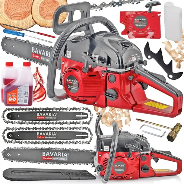 W komplecie znajduje się bogaty zestaw akcesoriów, w tym dwie prowadnice (40 cm i 45 cm), dwa łańcuchy tnące wysokiej jakości, zapasowy starter, osłona prowadnicy, zestaw kluczy oraz pojemnik na mieszankę. Dodatkowo, w prezencie dołączony jest wysokiej klasy olej półsyntetyczny do mieszanki, ułatwiający optymalne dotarcie silnika.