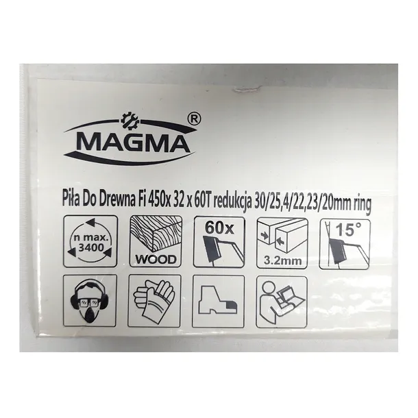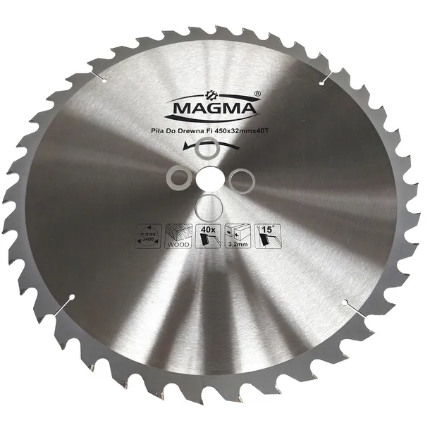 Piła widiowa do drewna 450 mm 40T zębna z otworem 32 mm redukcja na 30 mm 25,4 mm 22,23 mm 20 mm marki Magma.
