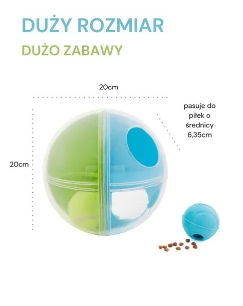 Zawiera piłkę do labiryntu, piłkę na smakołyki i piłkę tenisową. Możliwość zabawy dołączonymi piłkami albo dużą kulą do labiryntu.