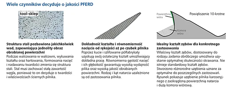 Wskazówki ogólne: jednorodna mikrostruktura stali jako warunek uzyskania równomiernej twardości. Rodzaj i kąt nacięcia zależą od zastosowania, przy czym rozróżnia się nacięcie 1 do obróbki zgrubnej, nacięcie 2 do obróbki półwykańczającej/uniwersalnej i nacięcie 3 do obróbki wykańczającej. Idealna geometria zębów do każdego zastosowania. Długość pilnika mierzona jest bez chwytu od wierzchołka do nasady chwytu.