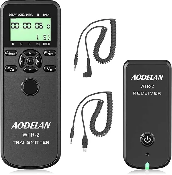 - Bezprzewodowy i przewodowy: Zestaw zdalnego sterowania zawiera timer i odbiornik, który może działać jako timer i zdalne zwalnianie migawki. Po podłączeniu odbiornika do kamery timer może być używany jako bezprzewodowy pilot zdalnego sterowania do zdalnego sterowania odbiornikiem. Ponadto timer można również podłączyć bezpośrednio do kamery jako przewodowy pilot zdalnego sterowania.