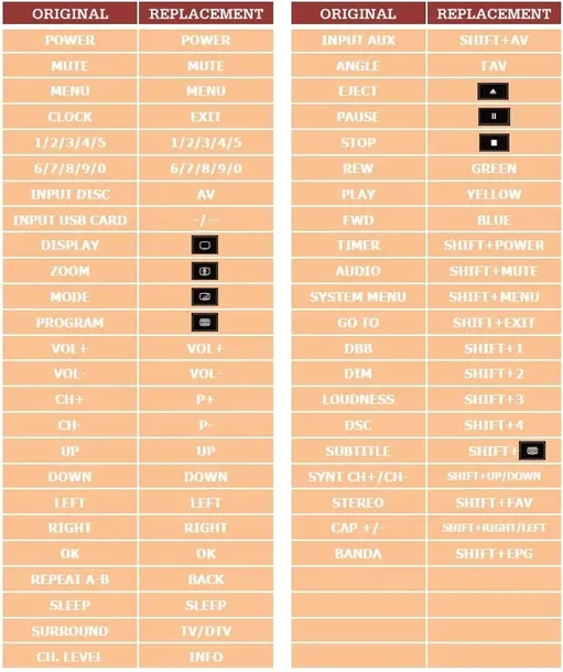 Ponieważ pilot może mieć wiele przycisków, w pilocie zastępczym znajdziesz Shift przycisk, który umożliwia podwojenie liczby przycisków na pilocie. Najczęstsze funkcje wykonuje się zwykle za pomocą bezpośredniego wciśnięcia (poprzez naciśnięcie jednego przycisku), podczas gdy mniej typowe funkcje wykonuje się zwykle za pomocą przycisku Shift, a następnie innego przycisku.