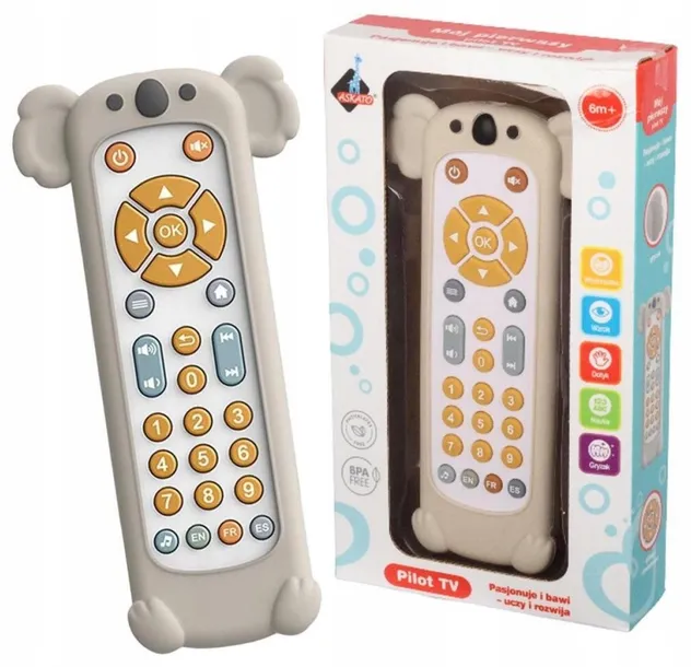 Pilot do telewizora z silikonową osłonką. - KOALA Dostępne języki: angielski, hiszpański, francuski. wymiary opakowania: 9.4x3.5x18.1 cm wiek: 6m+