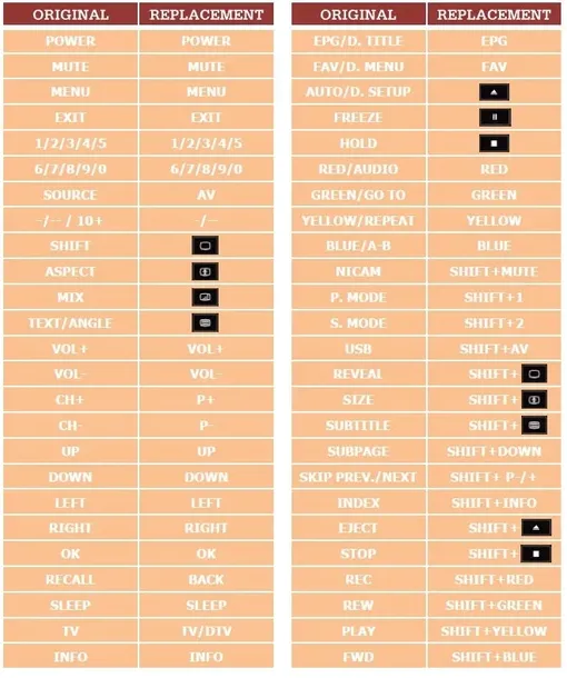 Ponieważ pilot może mieć wiele przycisków, w pilocie zastępczym znajdziesz Shift przycisk, który umożliwia podwojenie liczby przycisków na pilocie. Najczęstsze funkcje wykonuje się zwykle za pomocą bezpośredniego wciśnięcia (poprzez naciśnięcie jednego przycisku), podczas gdy mniej typowe funkcje wykonuje się zwykle za pomocą przycisku Shift, a następnie innego przycisku.