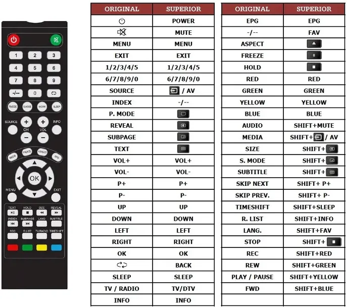 Wygląd pilota oryginalnego pokazany w celu informacyjnym. Zakodowane funkcje widoczne w tabeli.