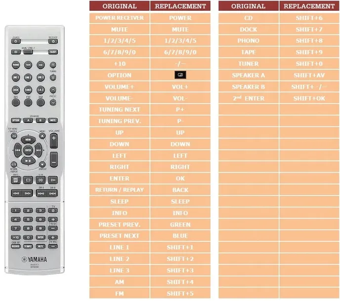 Ponieważ pilot może mieć wiele przycisków, w pilocie zastępczym znajdziesz Shift przycisk, który umożliwia podwojenie liczby przycisków na pilocie. Najczęstsze funkcje wykonuje się zwykle za pomocą bezpośredniego wciśnięcia (poprzez naciśnięcie jednego przycisku), podczas gdy mniej typowe funkcje wykonuje się zwykle za pomocą przycisku Shift, a następnie innego przycisku.