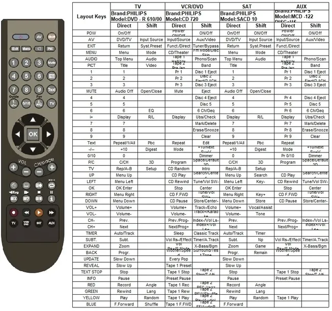 Zaprogramowane cztery banki po kolei do różnych sprzętów według listy powyżej. Przełączanie między bankami - klawisze TV VCD/DVD SAT AUX.