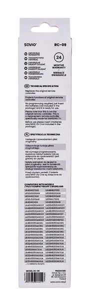 - Ostrzeżenia: Trzymać poza zasięgiem dzieci - zawiera małe elementy, które mogą być niebezpieczne., Produkt należy utylizować zgodnie z lokalnymi przepisami dotyczącymi urządzeń elektronicznych., Nie otwierać obudowy pilota - ryzyko kontaktu z substancjami chemicznymi.