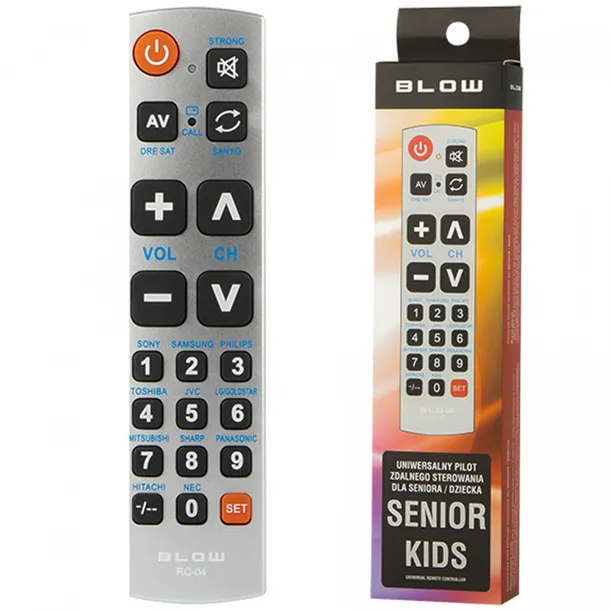 - Wyjątkowy pilot marki BLOW dedykowany głównie seniorom - cechują go przede wszystkim duże przyciski oraz nieskomplikowana obsługa, a jednocześnie pełna funkcjonalność w podstawowych zadaniach związanych z użytkowaniem telewizora.
