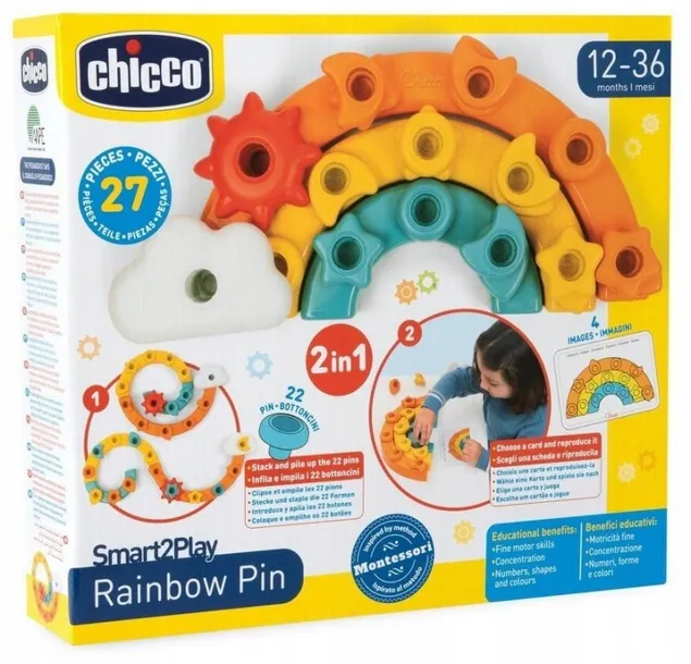 TĘCZOWE WPINKI Grupa wiekowa: 12-36 miesięcyTęczowe Wpinki to wyjątkowa, edukacyjna zabawka, która pozwala dzieciom rozwijać zdolności manualne, kreatywność i logiczne myślenie. Zestaw zawiera aż 27 kolorowych elementów, w tym 20 wpinek, 3 tęczowe łuki, chmurkę, słońce oraz torbę na przechowywanie wpinek. Zabawka oferuje dwa tryby zabawy: 1) Swobodna zabawa dziecko może układać wpinki i tworzyć dowolne konfiguracje, rozwijając przy tym małą motorykę i koordynację ręka-oko. 2) Edukacyjna zabawa z pomocą kart dołączonych do zestawu maluch może uczyć się kolorów, liczb i kształtów. Dzięki zadaniom na kartach dziecko rozwija umiejętność sortowania oraz ćwiczy pamięć wzrokową. Stworzona we współpracy z włoskim stowarzyszeniem pedagogów, Tęczowe Wpinki zapewniają edukacyjną zabawę w przyjazny i bezpieczny sposób, ponieważ są wolne od farb i lekkie w konstrukcji. To doskonała zabawka, która zachęca do nauki poprzez zabawę i wspiera rozwój maluchów na każdym etapie.