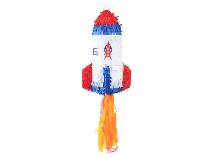 Pinata ze sznureczkami Rakieta, idealna na urodziny dla dziecka. Zabawa polega na strąceniu zawieszonej dekoracji z reguły wypełnionej słodyczami. Wersja piniaty ze sznurkami do ciągnięcia.Wielkość: 40 x 27 x 27 cm.Opakowanie: 1 szt.