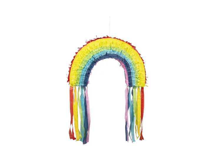 Piniata Tęcza M.Produkt polecany na Urodziny lub każdą inną okazję.Średnia Piniata w kształcie tęczy. Wymiary: 23 × 35 × 5 cm.Materiał: 100% papier.