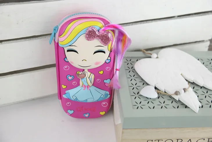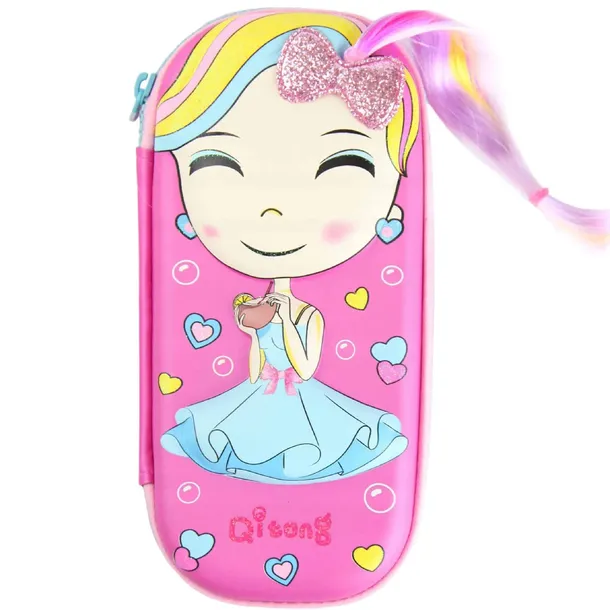 Śliczny piórnik z laleczką z tęczowymi włosami oraz brokatową kokardą, na pewno zaskoczy wszystkie koleżanki w klasie i nie tylko. Laleczka jest lekko wypukła. MUST HAVE każdej dziewczynki.